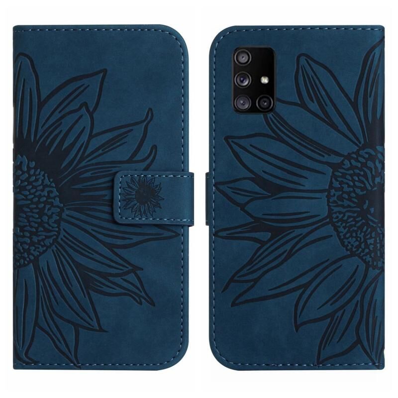 Για το Samsung Galaxy A71 δέρμα αίσθηση Sun Flower μοτίβο Flip δέρμα τηλέφωνο υπόθεση με κορδόνι (μπλε)