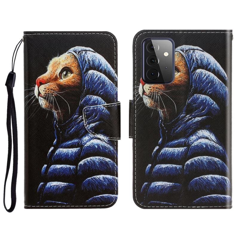 Θήκη τηλεφώνου Samsung Galaxy A72 3D με έγχρωμο σχέδιο, οριζόντια αναδιπλούμενη από δέρμα με βάση στήριξης & θήκες για κάρτες & πορτοφόλι (Γάτα με χειμερινό μπουφάν)