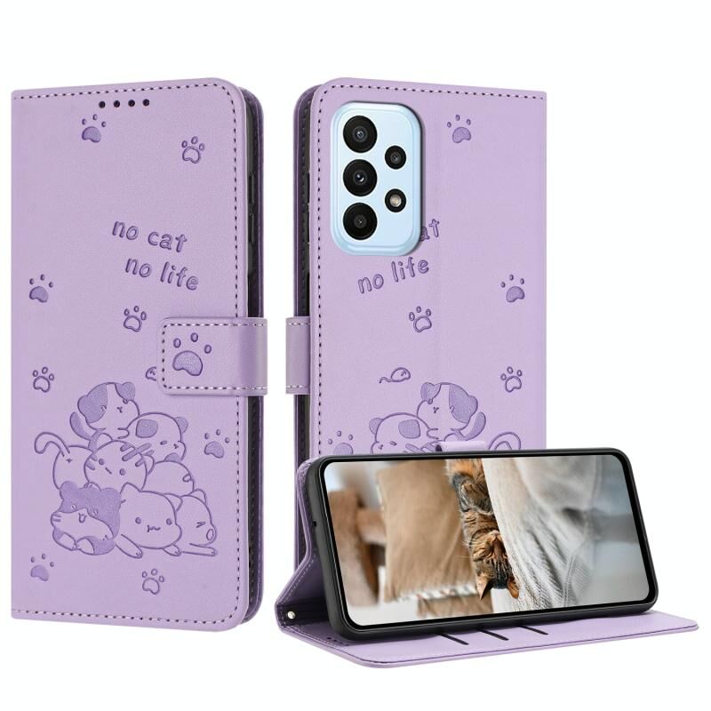 Θήκη δερμάτινη για Samsung Galaxy A72 4G / 5G με ανάγλυφο σχέδιο γατάκι και λουρί (Μωβ)