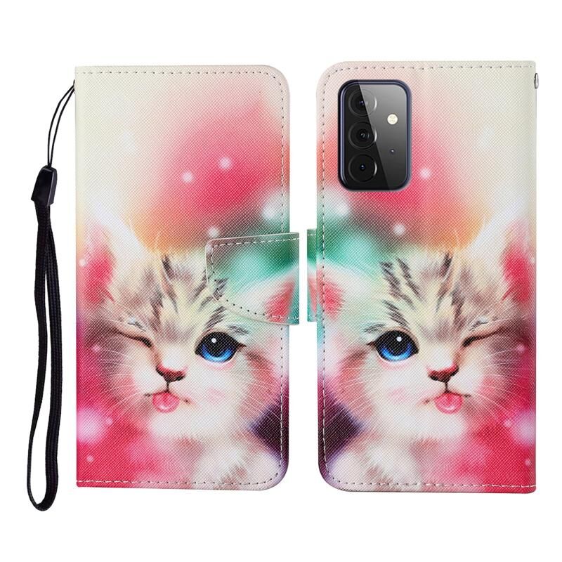 Θήκη δέρματος οριζόντιας αναδίπλωσης με σχέδια πολύχρωμης ζωγραφικής για Samsung Galaxy A72 5G / 4G με βάση στήριξης & θήκες καρτών & πορτοφόλι & κορδόνι (Γατάκι με στραβισμό)