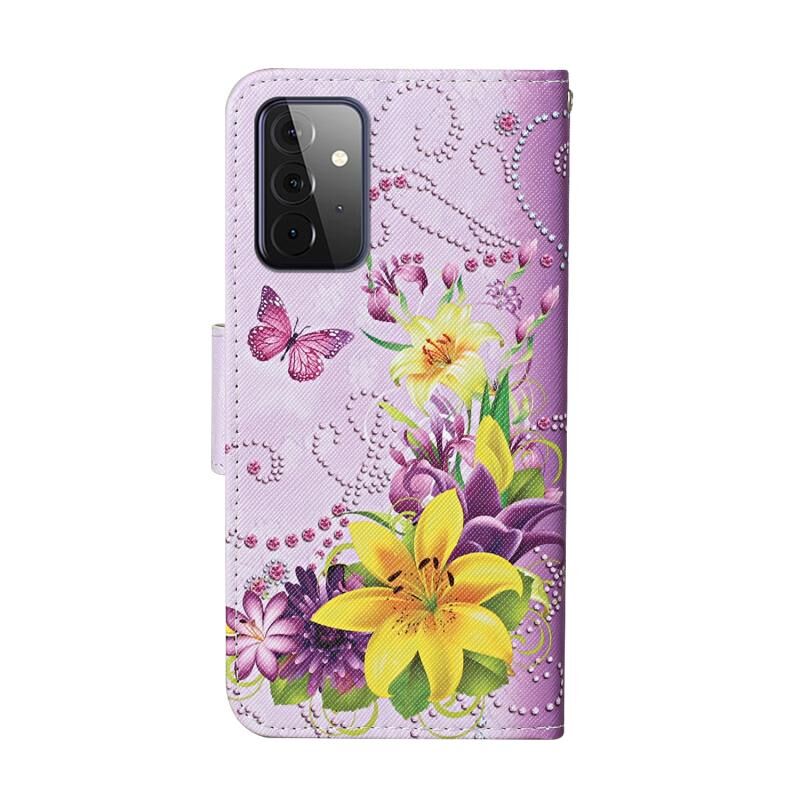 Θήκη δέρματος οριζόντιας αναδίπλωσης με σχέδια ζωγραφικής, χρώματα για Samsung Galaxy A72 5G / 4G με βάση στήριξης & θήκες καρτών & πορτοφόλι & κορδόνι (Κίτρινο Πεταλούδα Λουλούδι)