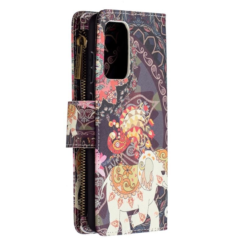 Θήκη δέρματος οριζόντιας αναδίπλωσης με φερμουάρ και σχέδια ζωγραφικής για Samsung Galaxy A72 5G / 4G με βάση για κάρτες & πορτοφόλι (Λουλούδια & Ελέφαντες)