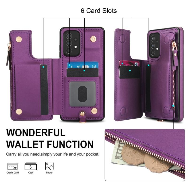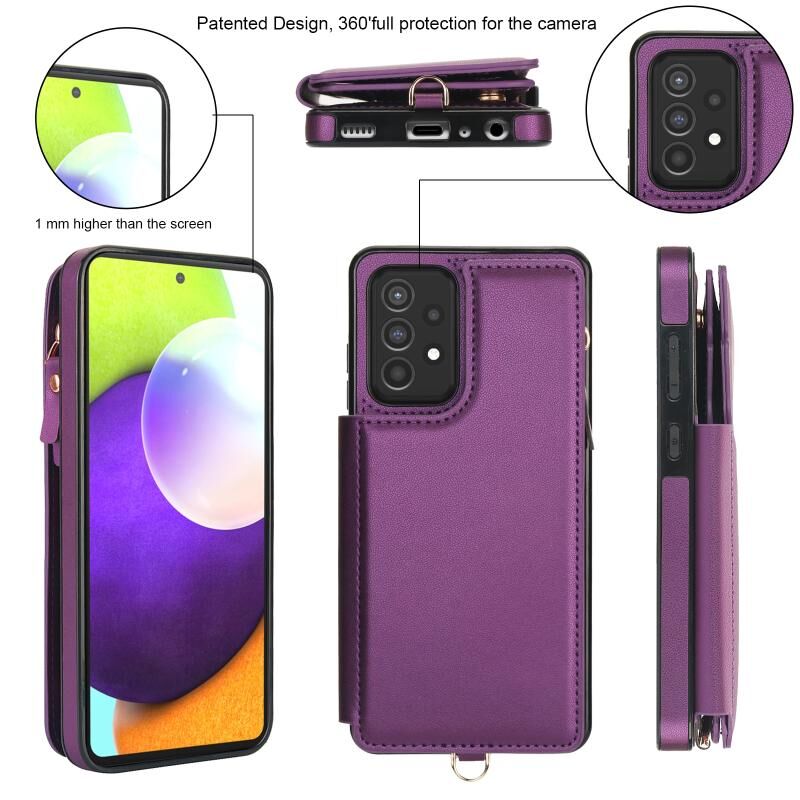 Θήκη τηλεφώνου Samsung Galaxy A72 5G από δέρμα με διπλό κλείσιμο με φερμουάρ και RFID, με κοντό κορδόνι (Σκούρο μωβ)