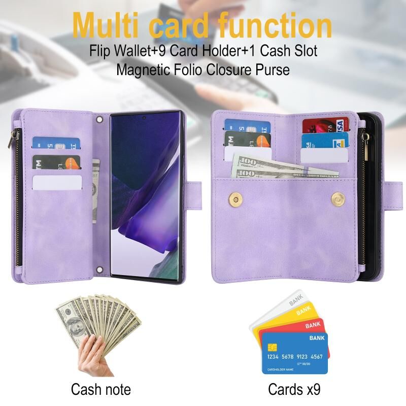 2. Λειτουργία πορτοφολιού πολλαπλών καρτών: 9 υποδοχές για κάρτες και 1 θήκη μετρητών με φερμουάρ για να αποθηκεύετε τις πιστωτικές σας κάρτες, μετρητά ή μικρά χαρτονομίσματα για τις καθημερινές σας ανάγκες.
