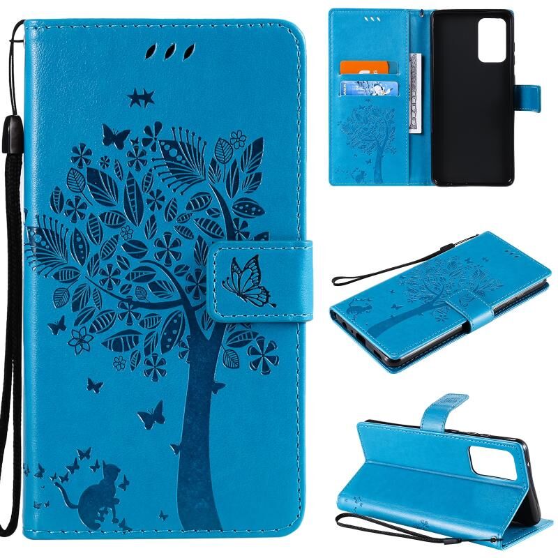 Για Samsung Galaxy A72 5G Δέντρο & Γάτα μοτίβο πιεσμένη εκτύπωση οριζόντια Flip PU δέρμα υπόθεση με θήκη & υποδοχές για κάρτες & πορτοφόλι & κορδόνι (μπλε)