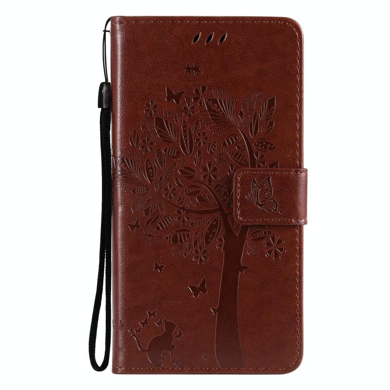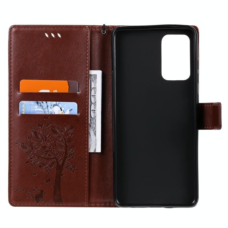 Για Samsung Galaxy A72 5G Δέντρο & Γάτα μοτίβο πιεσμένη εκτύπωση οριζόντια Flip PU δερμάτινη θήκη με κάτοχο & υποδοχές για κάρτες & πορτοφόλι & κορδόνι (καφέ)