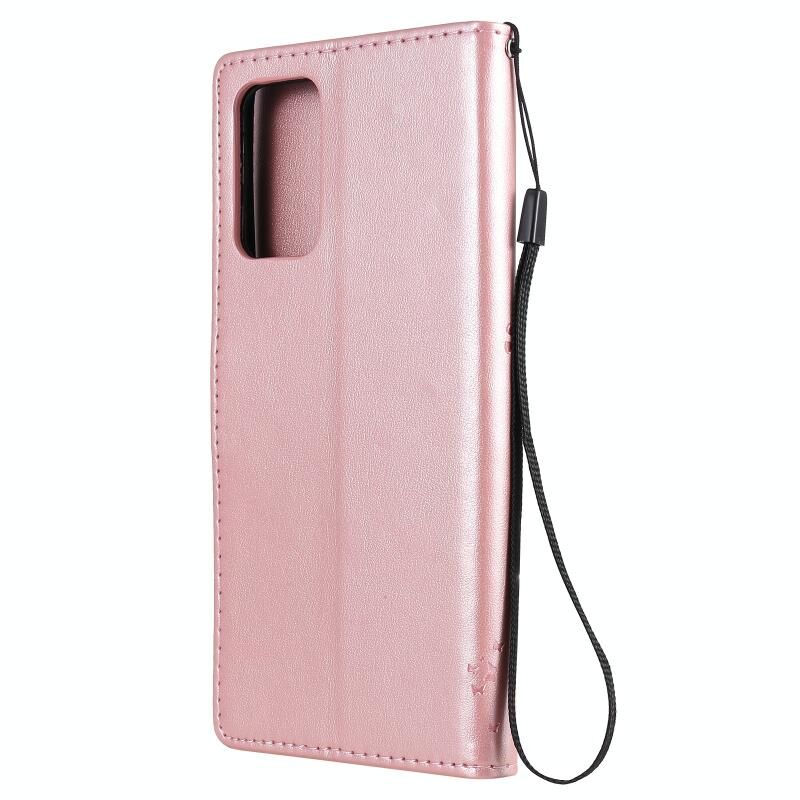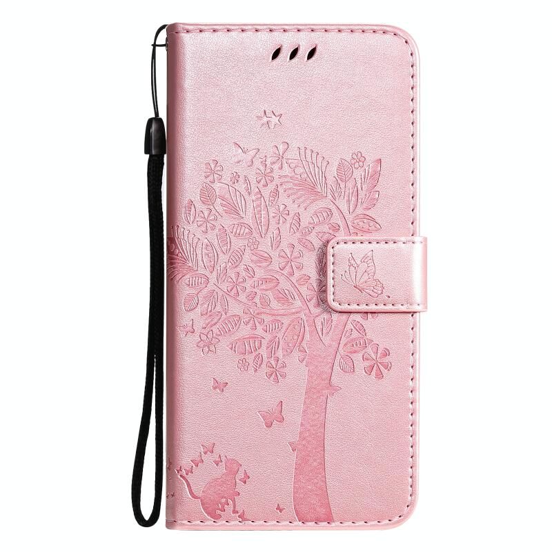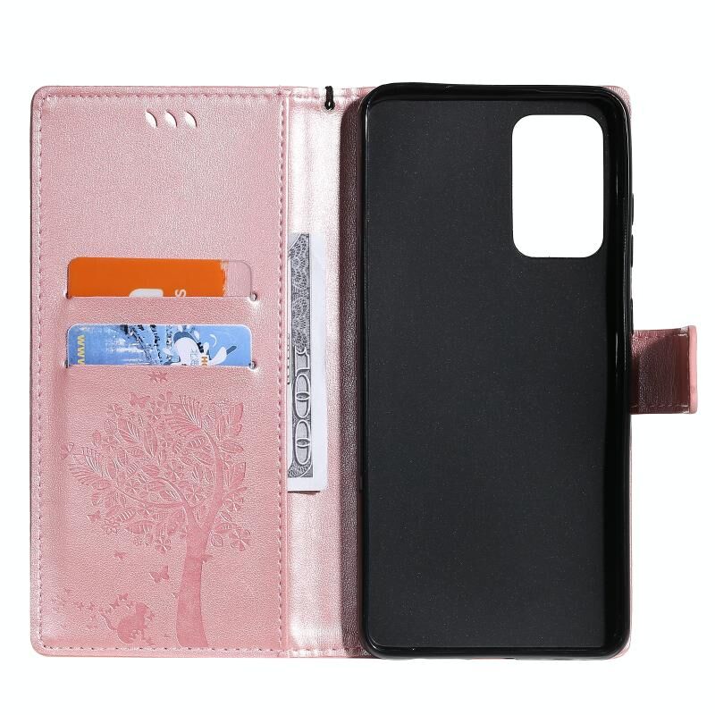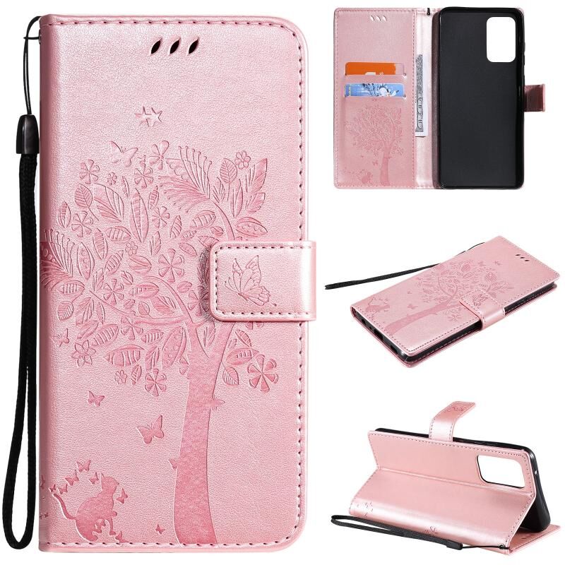 Για Samsung Galaxy A72 5G Δέντρο & Cat μοτίβο πιεσμένη εκτύπωση οριζόντια Flip PU δέρμα υπόθεση με θήκη & υποδοχές για κάρτες & πορτοφόλι & κορδόνι (Rose χρυσό)