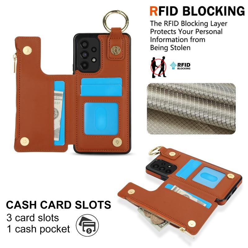 Για Samsung Galaxy A73 4G / 5G RFlD Anti-theft Διπλό πόρπη δαχτυλίδι φερμουάρ τηλέφωνο υπόθεση κάρτα (καφέ)