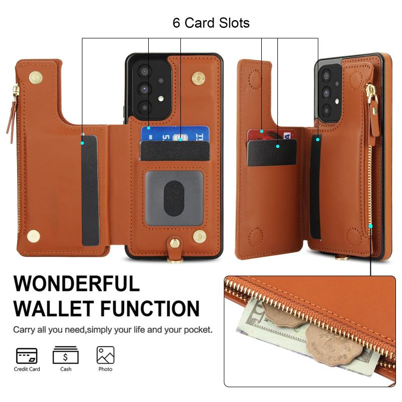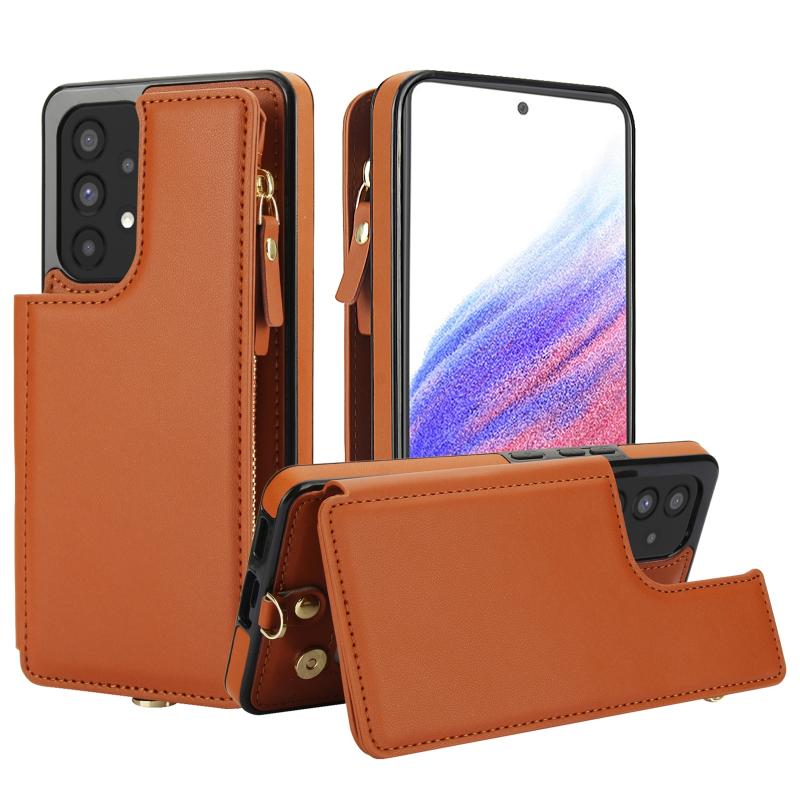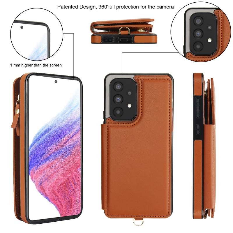 For Samsung Galaxy A73 5G Double Flap Zipper RFID Leather Phone Case with Short Lanyard(Brown)