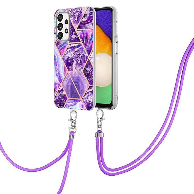 Θήκη κινητού τηλεφώνου Samsung Galaxy A73 5G με γαλβανισμό, συνδυασμό μαρμάρου και TPU με κορδόνι (Σκούρο Μωβ)