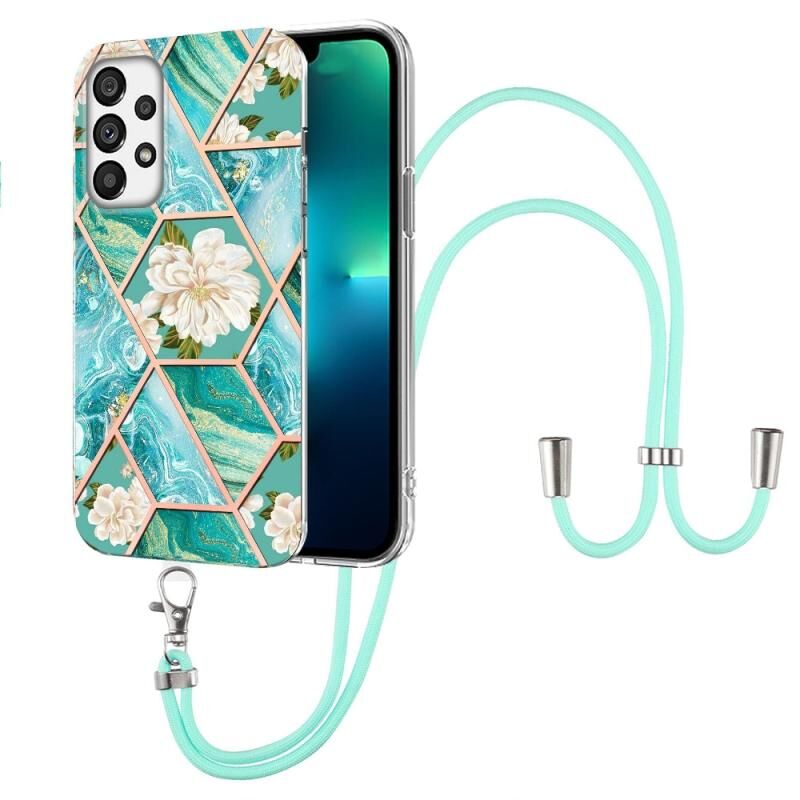 Θήκη κινητού τηλεφώνου TPU με σχέδιο μαρμάρου και λουλουδιών patchwork για Samsung Galaxy A73 5G με κορδόνι (Ροζ Λουλούδι)
