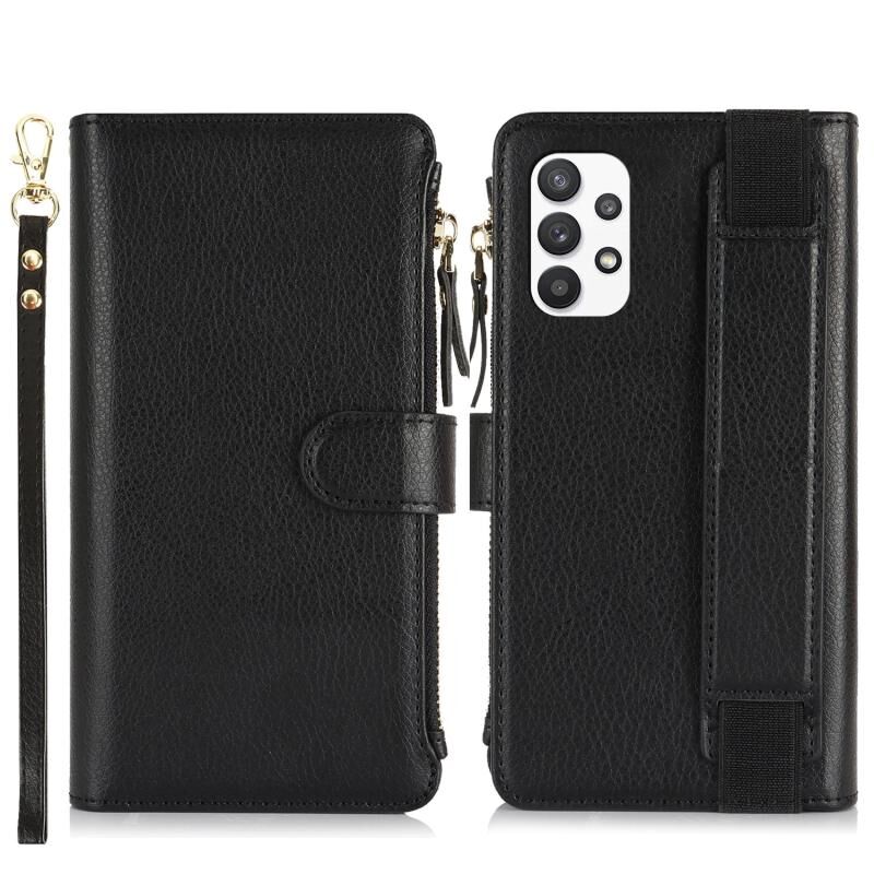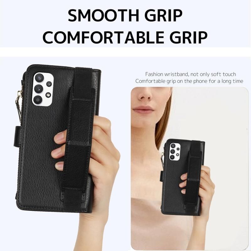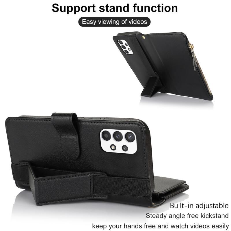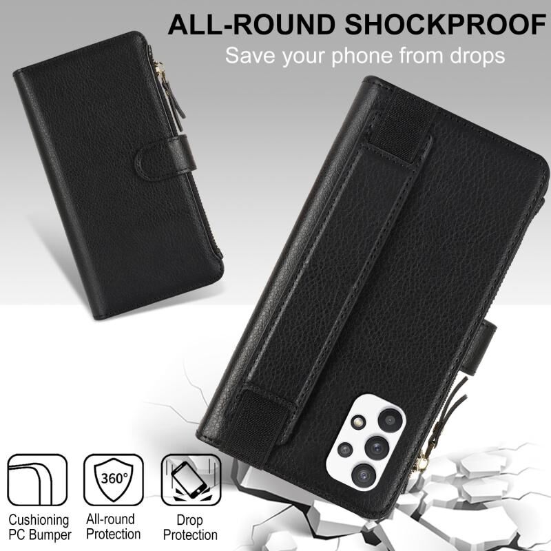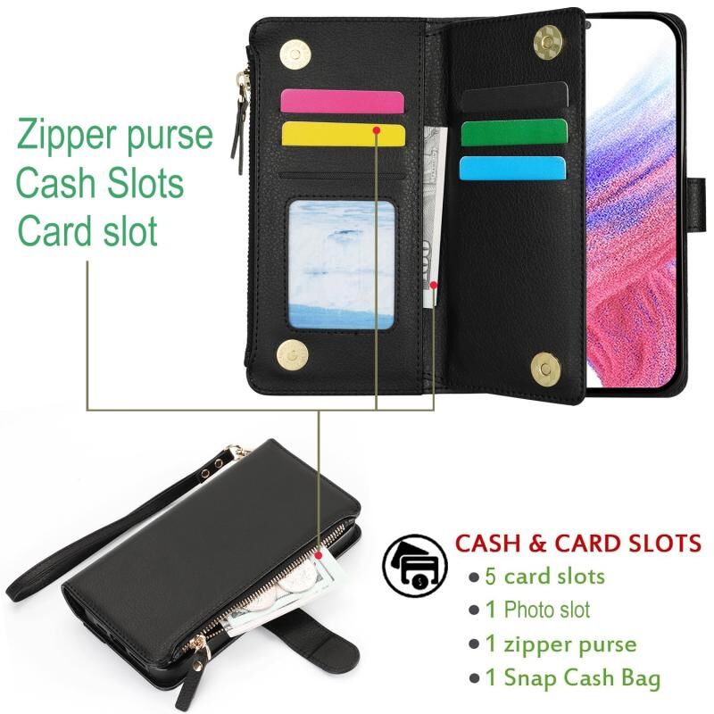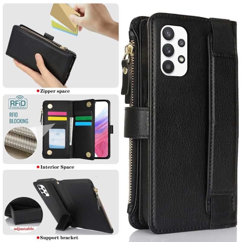 Για Samsung Galaxy A73 Wristband κάτοχος φερμουάρ πορτοφόλι RFID δερμάτινη θήκη τηλεφώνου (Μαύρο)