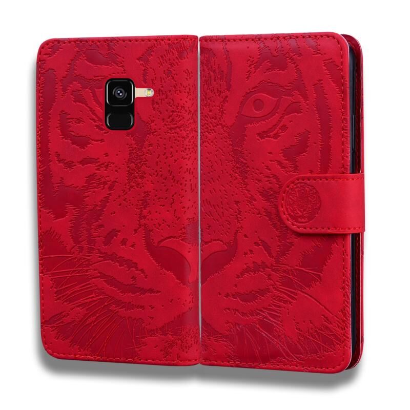Θήκη δέρματος οριζόντιας αναδίπλωσης με ανάγλυφο μοτίβο τίγρης για Samsung Galaxy A8 (2018) με βάση & υποδοχές καρτών & πορτοφόλι (Καφέ)