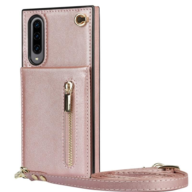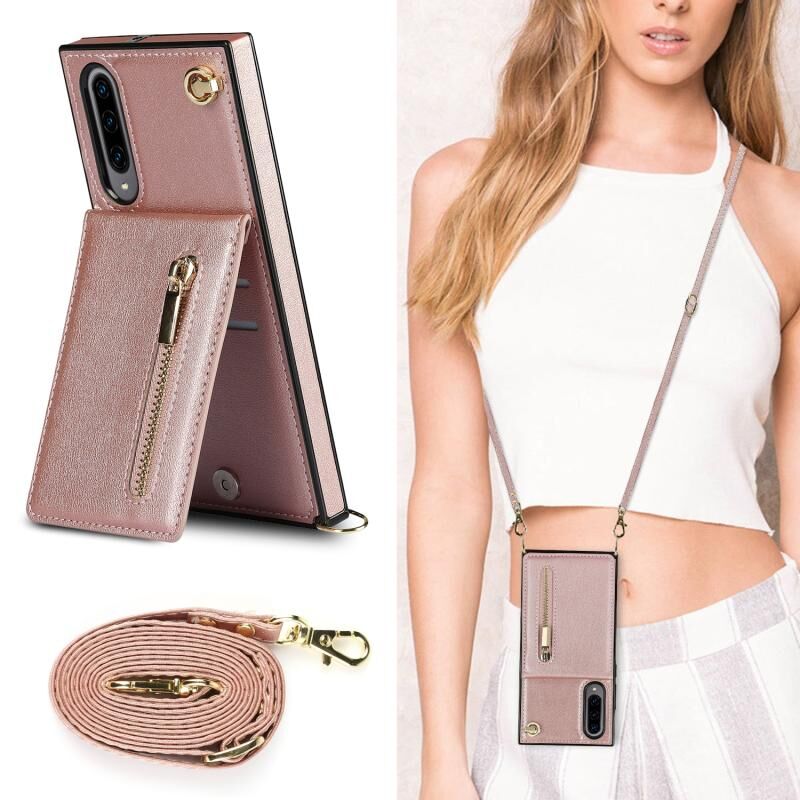 Για Samsung Galaxy A90 5G Cross-body φερμουάρ τετράγωνο TPU + PU πίσω κάλυμμα υπόθεση με θήκη & υποδοχές για κάρτες & πορτοφόλι & λουράκι (Rose Gold)