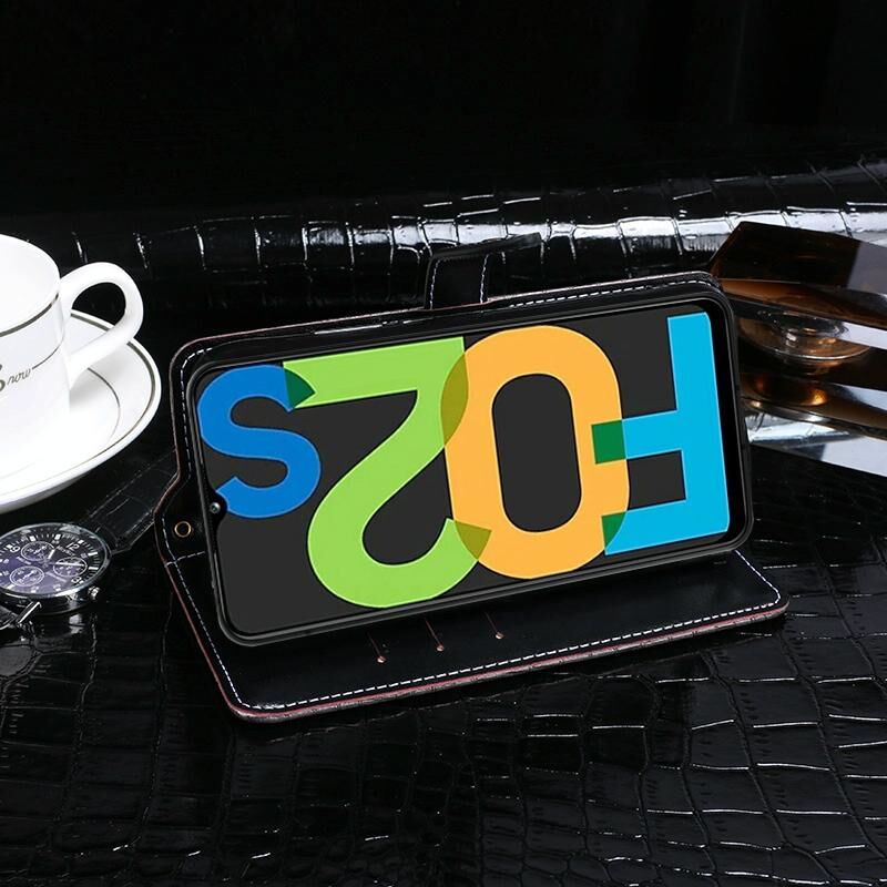 Θήκη δέρματος οριζόντιας αναδίπλωσης με υφή κροκόδειλου idewei για Samsung Galaxy F02s με βάση & υποδοχές καρτών & πορτοφόλι (Μαύρο) (idewei)