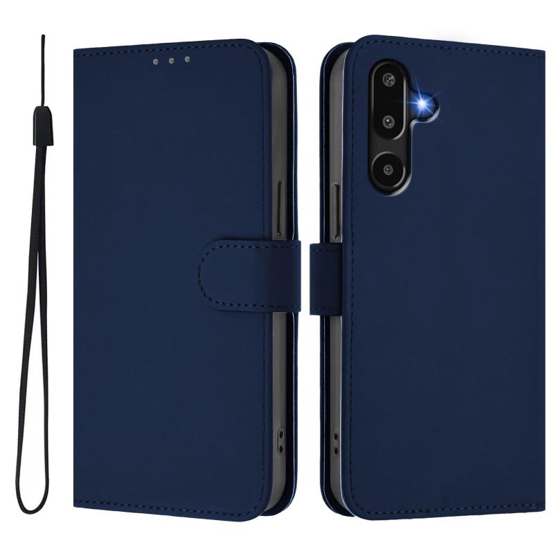 For Samsung Galaxy F16 5G Global Skin Feel Solid Color Leather Phone Case with Lanyard(Navy Blue)