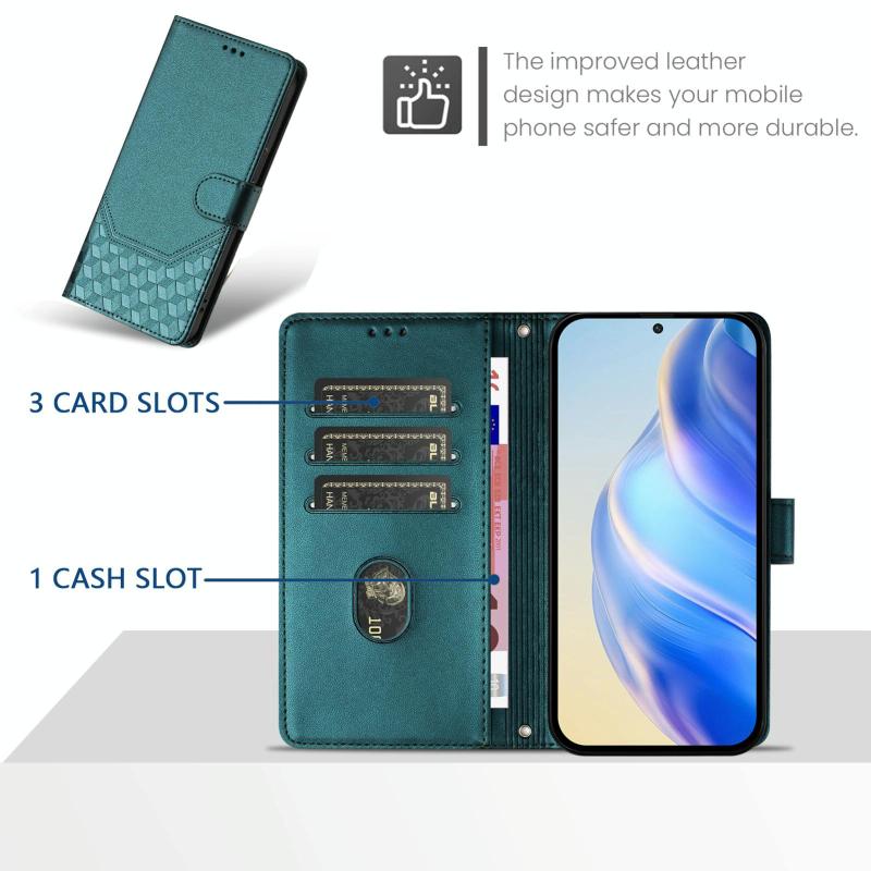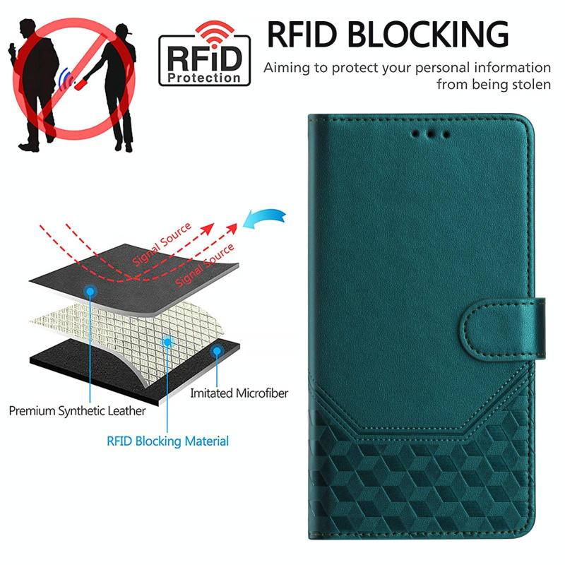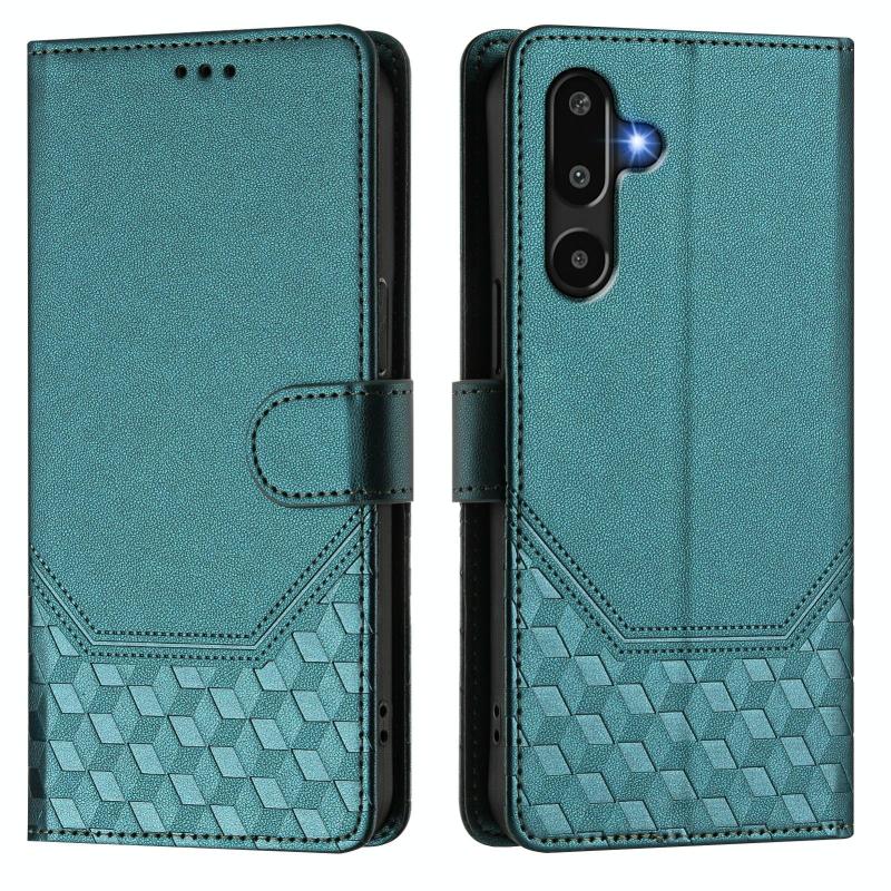 Θήκη τηλεφώνου Samsung Galaxy F16 5G / M16 5G Global με ανάγλυφο κυψελωτό σχέδιο RFID από δέρμα (Πράσινο παγωνιού)