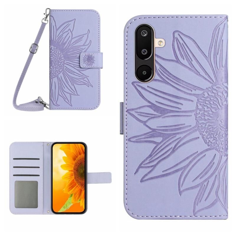 Θήκη τηλεφώνου Samsung Galaxy F16 5G / M16 5G με αίσθηση δέρματος, ανάγλυφο ηλιοτρόπιο, δερμάτινη με λουρί (Μωβ)