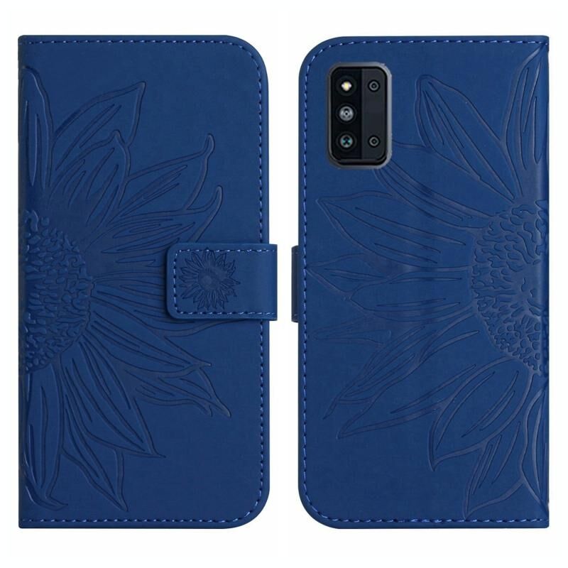 Για το Samsung Galaxy F52 5G δέρμα αίσθηση Sun Flower μοτίβο Flip δέρμα τηλέφωνο υπόθεση με κορδόνι (Σκούρο μπλε)