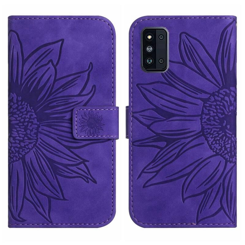 Για το Samsung Galaxy F52 5G δέρμα αίσθηση Sun Flower μοτίβο Flip δέρμα τηλέφωνο υπόθεση με κορδόνι (σκούρο μωβ)