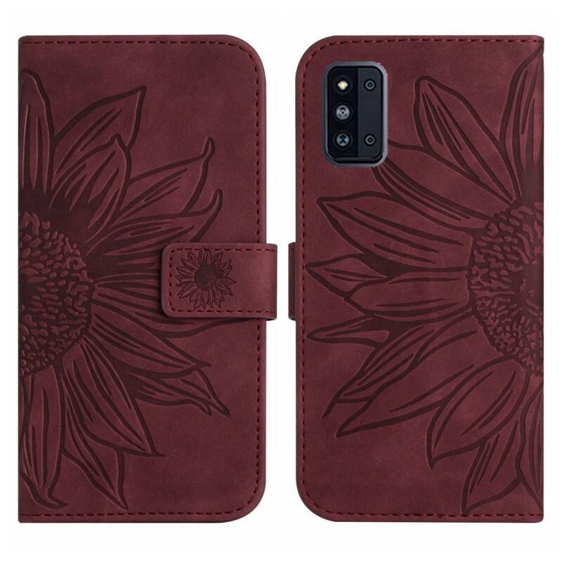 Για το Samsung Galaxy F52 5G δέρμα αίσθηση Sun Flower μοτίβο Flip δέρμα τηλέφωνο υπόθεση με κορδόνι (κόκκινο κρασί)