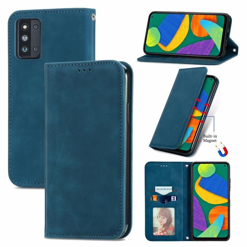 Για Samsung Galaxy F52 Ρετρό δέρμα Feel Business μαγνητική οριζόντια Flip δερμάτινη θήκη με κάτοχο & υποδοχές για κάρτες & πορτοφόλι & πλαίσιο φωτογραφιών (μπλε)