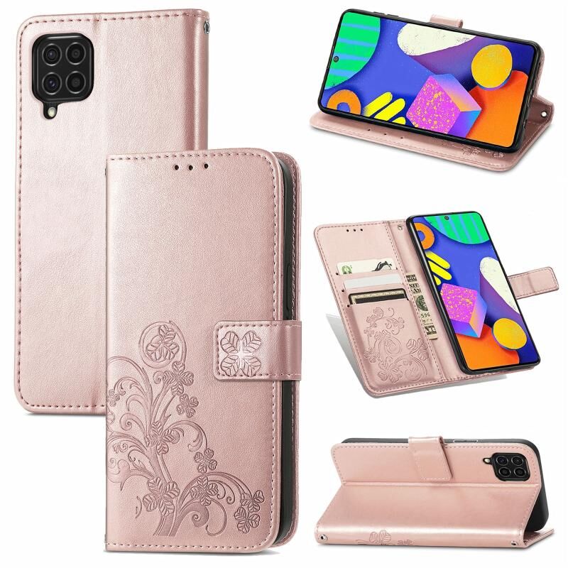 Για Samsung Galaxy F62/M62 Four-leaf Clasp ανάγλυφη αγκράφα Κινητό τηλέφωνο προστασία δερμάτινη θήκη με κορδόνι & υποδοχή για κάρτες & πορτοφόλι & βραχίονα λειτουργία (Ροζ χρυσός)