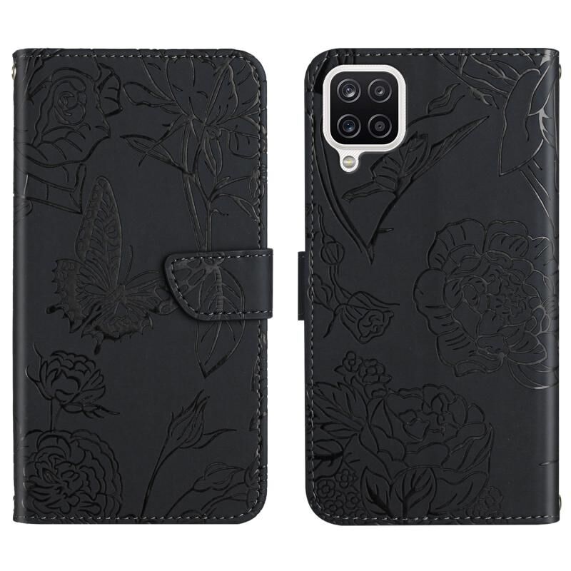 Θήκη τηλεφώνου Samsung Galaxy F62 / M62 με ανάγλυφο σχέδιο πεταλούδας και παιώνιας, δερμάτινη υφή (Μαύρο)