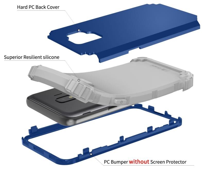 1. Το προϊόν αποτελείται από τρία στρώματα. Το ανώτερο στρώμα είναι το πλαίσιο PC για την προστασία της άκρης του κινητού τηλεφώνου. Το μεσαίο είναι κατασκευασμένο από σιλικόνη για να προστατεύει το πίσω κάλυμμα του κινητού τηλεφώνου από τη φθορά. Το κάτω στρώμα είναι η σκληρή θήκη από PC με λειτουργία κατά της πτώσης.