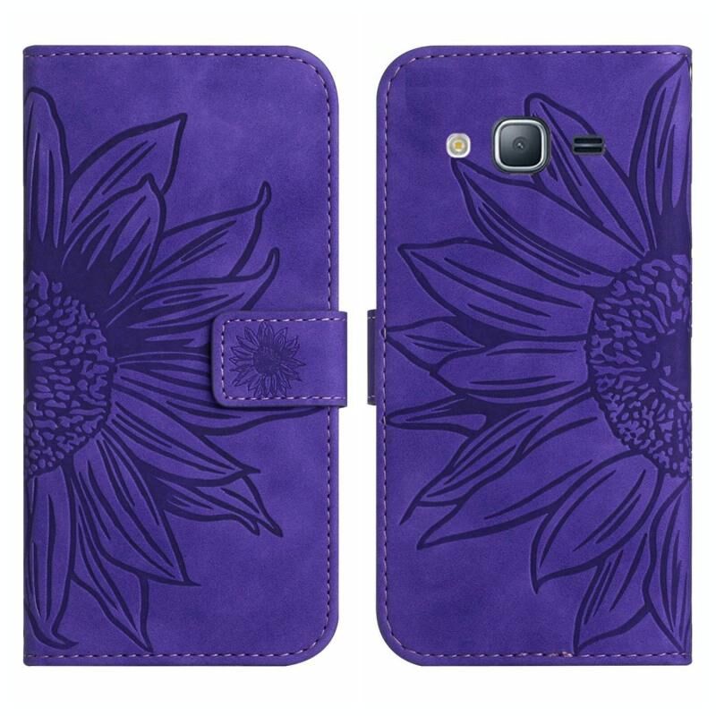 Για το Samsung Galaxy J2 Prime δέρμα αίσθηση Sun Flower μοτίβο Flip δέρμα τηλέφωνο υπόθεση με κορδόνι (σκούρο μωβ)
