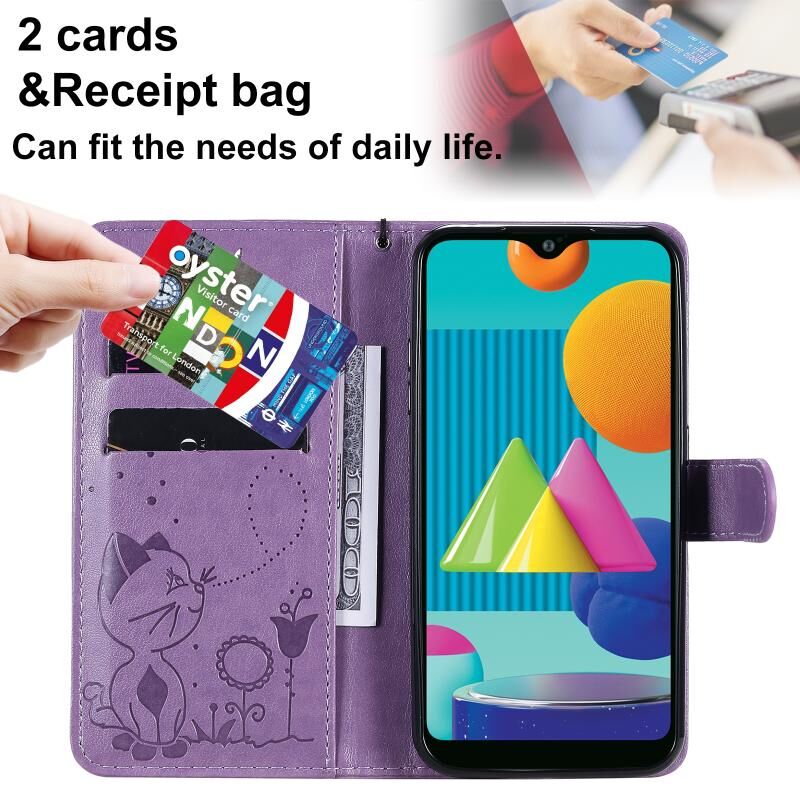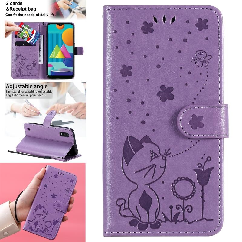 Θήκη Samsung Galaxy M01 Cat Bee με ανάγλυφο σχέδιο, αντικραδασμική, οριζόντια, από δέρμα με βάση στήριξης & θήκες για κάρτες & πορτοφόλι (Μπλε)