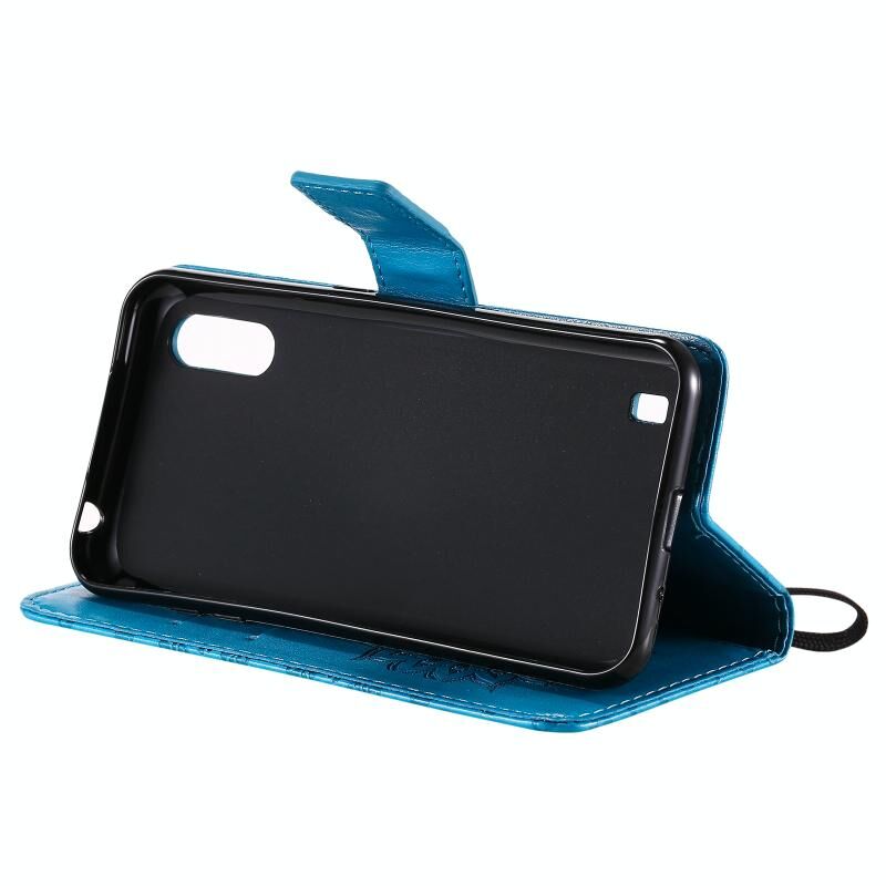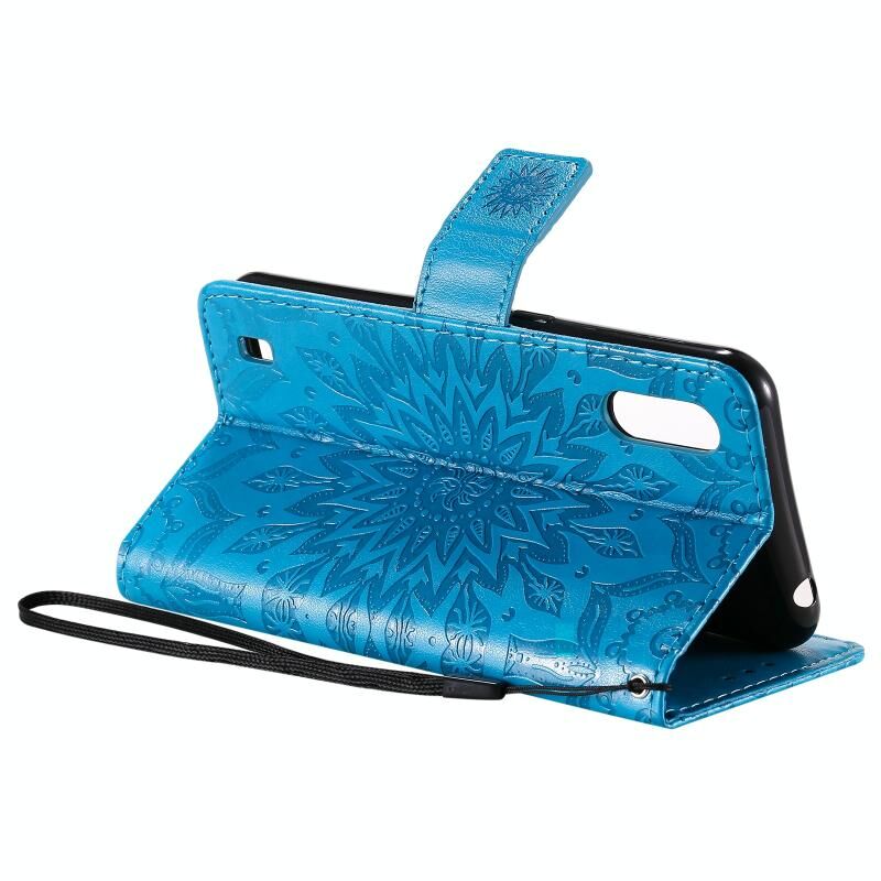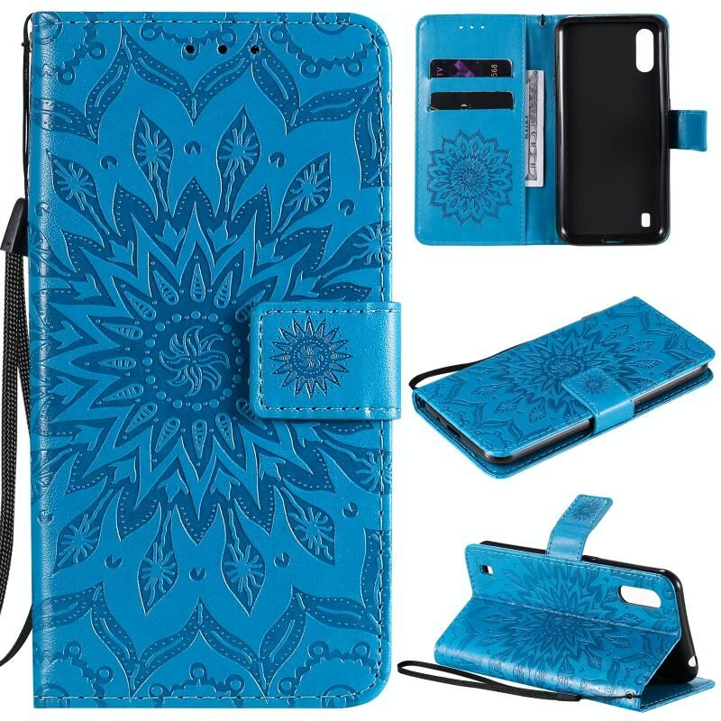 For Samsung Galaxy M01 Pressed Printing Sunflower Pattern Horizontal Flip PU Leather Case with Holder & Card Slots & Wallet & Lanyard(Blue)
