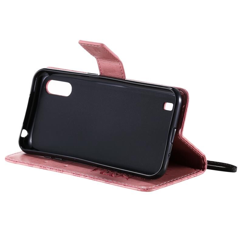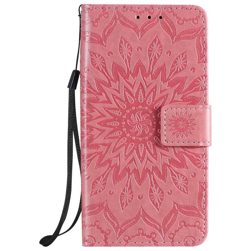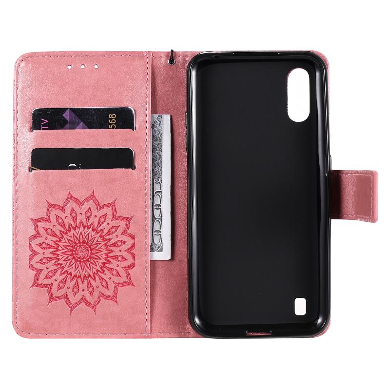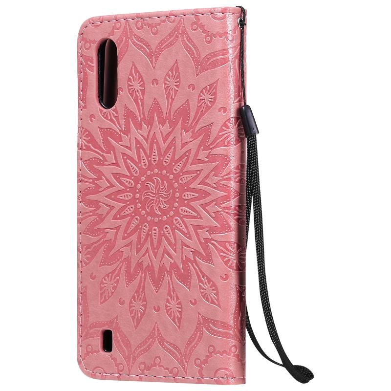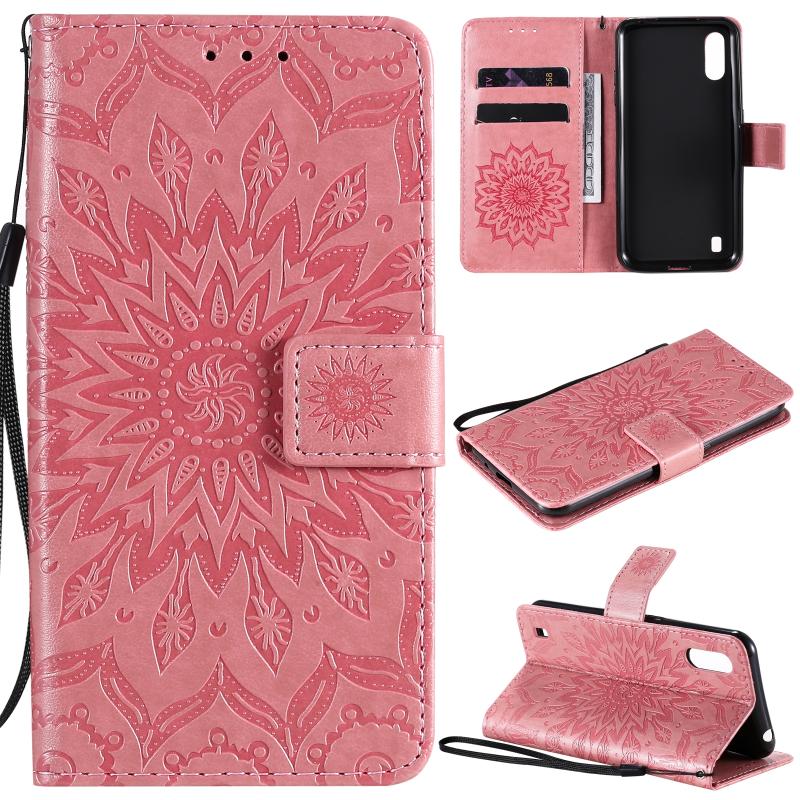 For Samsung Galaxy M01 Pressed Printing Sunflower Pattern Horizontal Flip PU Leather Case with Holder & Card Slots & Wallet & Lanyard(Pink)