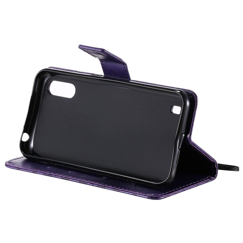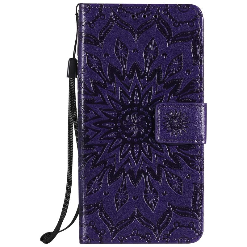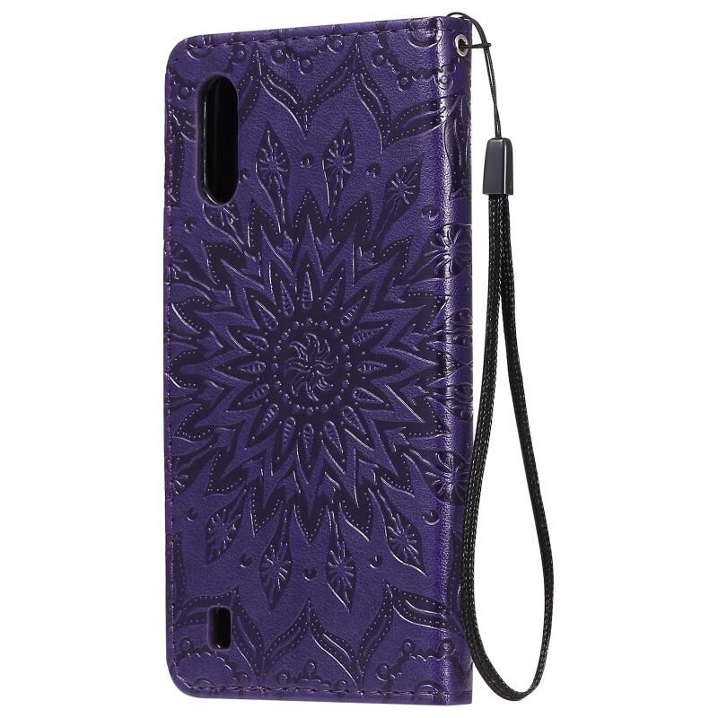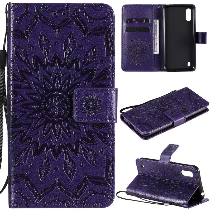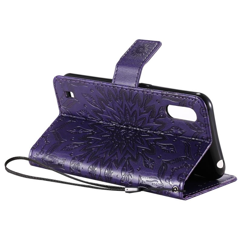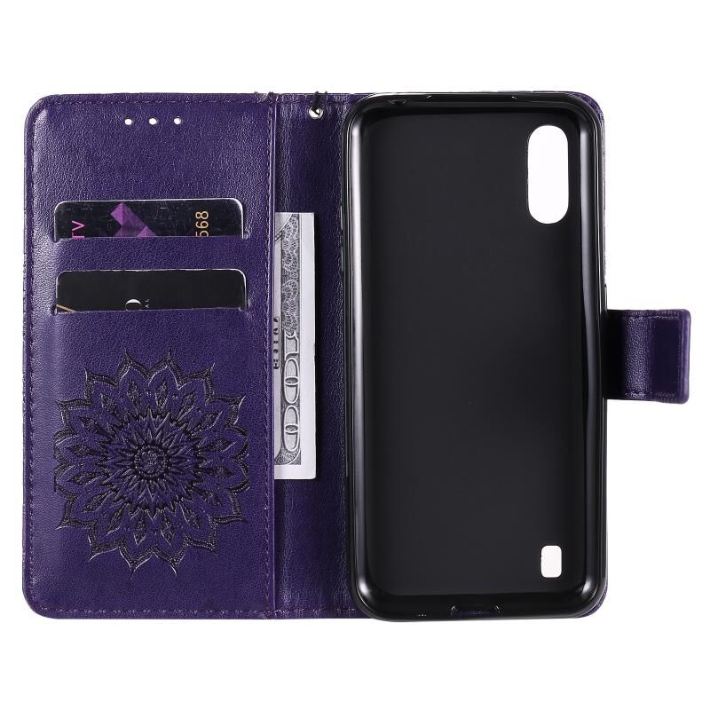 For Samsung Galaxy M01 Pressed Printing Sunflower Pattern Horizontal Flip PU Leather Case with Holder & Card Slots & Wallet & Lanyard(Purple)