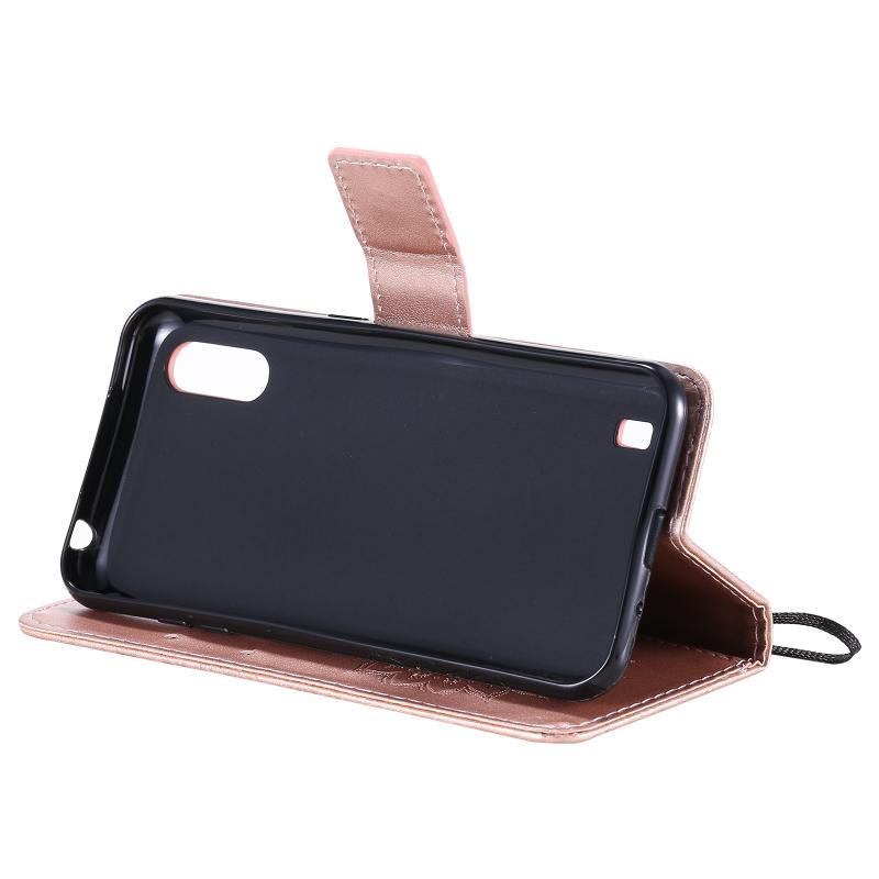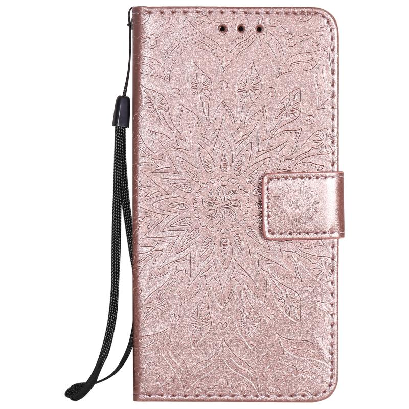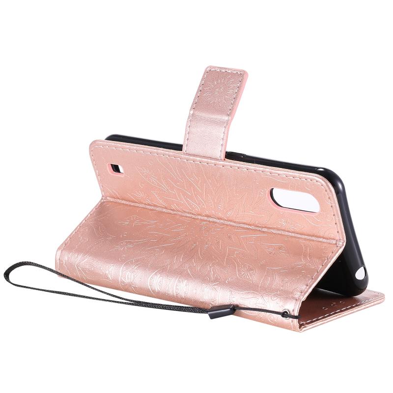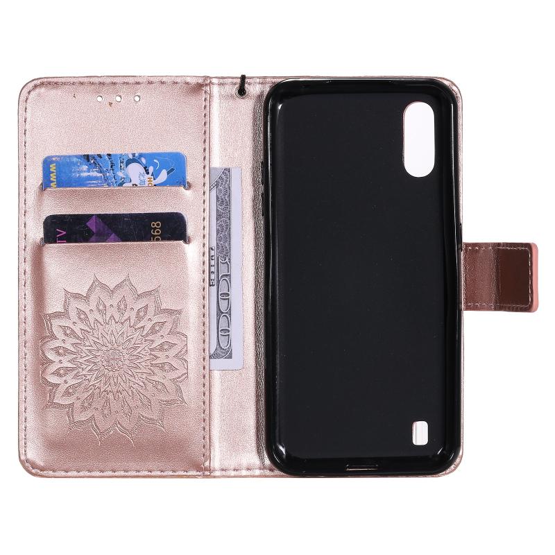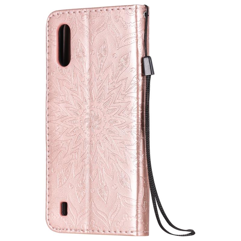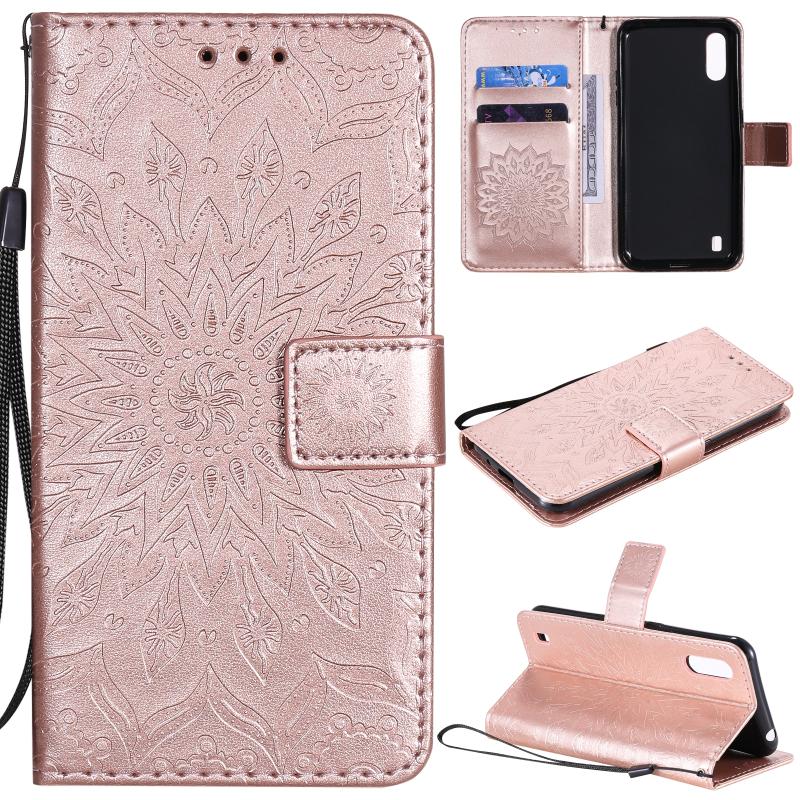 For Samsung Galaxy M01 Pressed Printing Sunflower Pattern Horizontal Flip PU Leather Case with Holder & Card Slots & Wallet & Lanyard(Rose Gold)