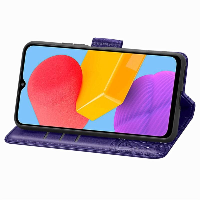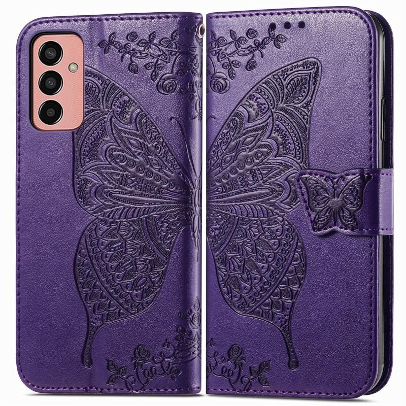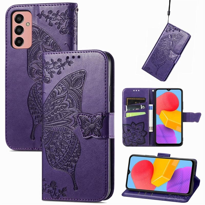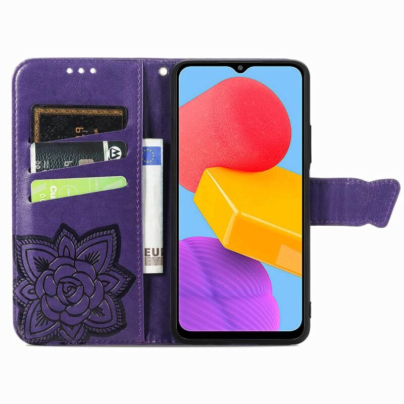 Θήκη τηλεφώνου Samsung Galaxy M13 4G, δερμάτινη, τύπου flip, με ανάγλυφο σχέδιο πεταλούδας και λουλουδιών (Μαύρο)