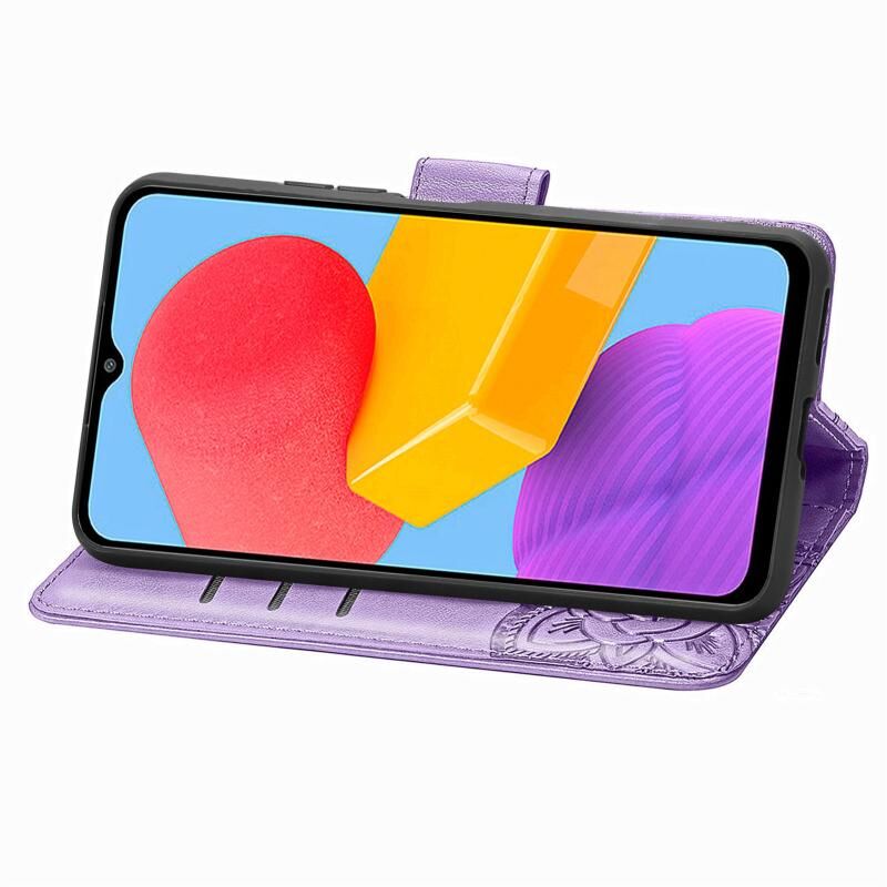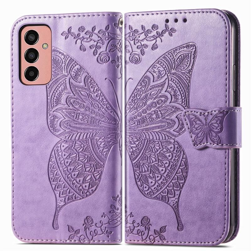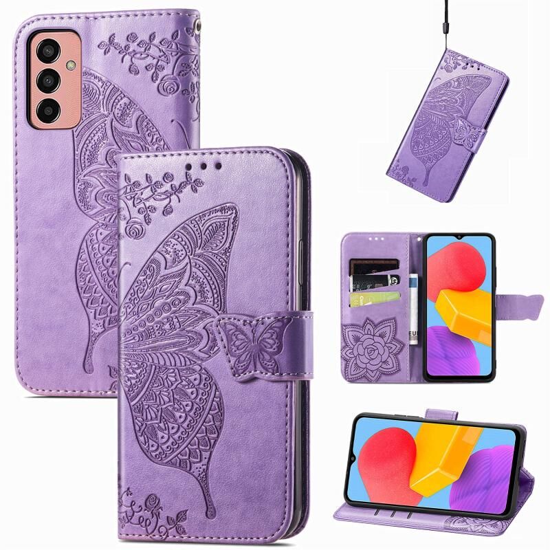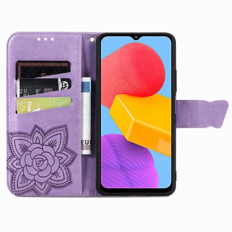 Θήκη τηλεφώνου Samsung Galaxy M13 4G, δερμάτινη, τύπου flip, με ανάγλυφο σχέδιο πεταλούδας και λουλουδιών (Μαύρο)