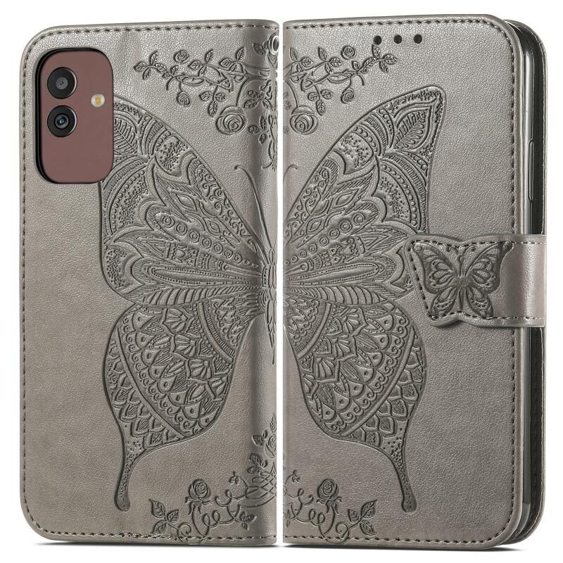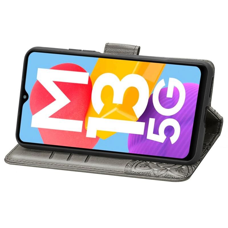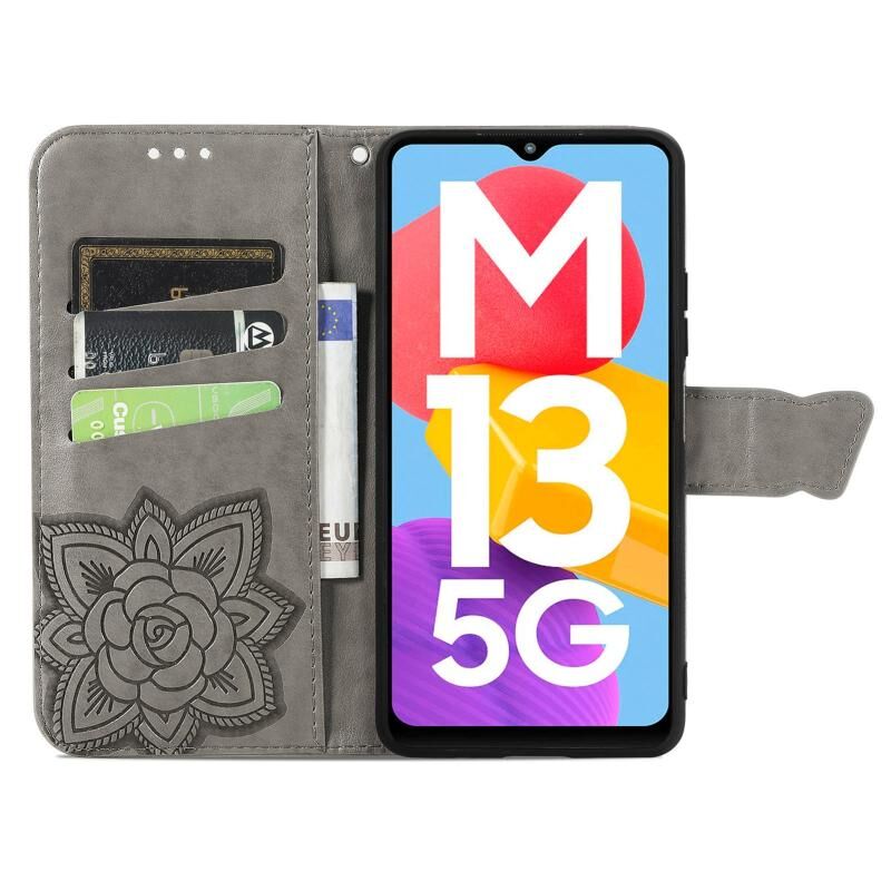 Θήκη τηλεφώνου Samsung Galaxy M13 5G, δερμάτινη, τύπου flip, με ανάγλυφο σχέδιο πεταλούδας και λουλουδιών (Μαύρο)