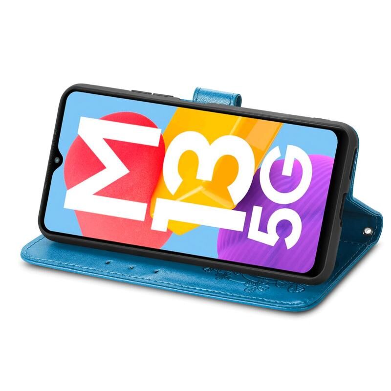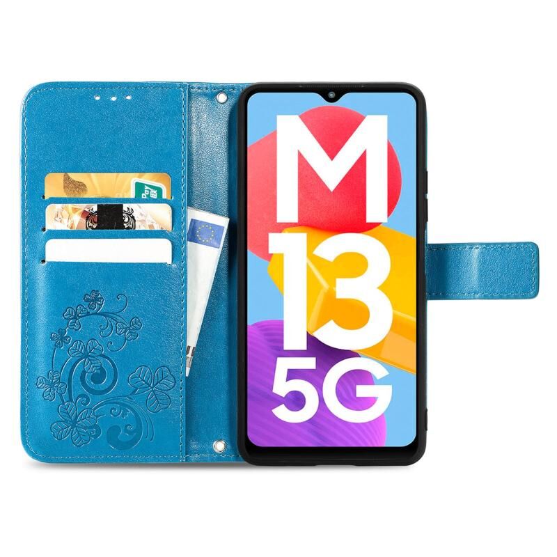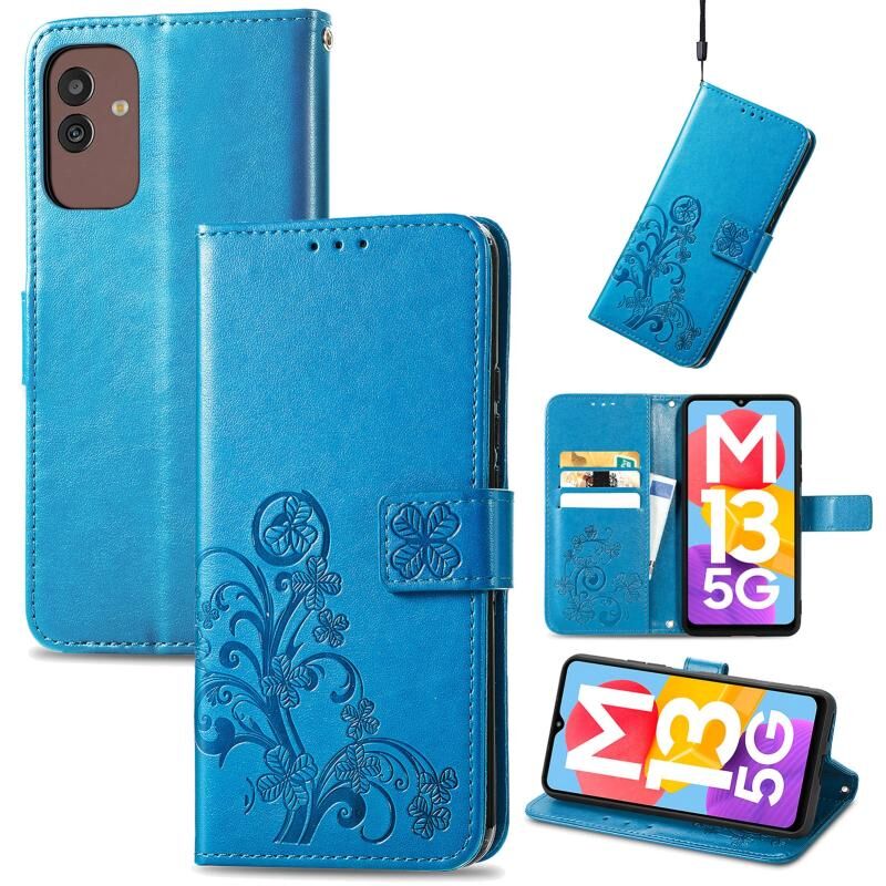 Για Samsung Galaxy M13 5G Four-leaf κούμπωμα ανάγλυφο αγκράφα δερμάτινη θήκη τηλεφώνου (μπλε)