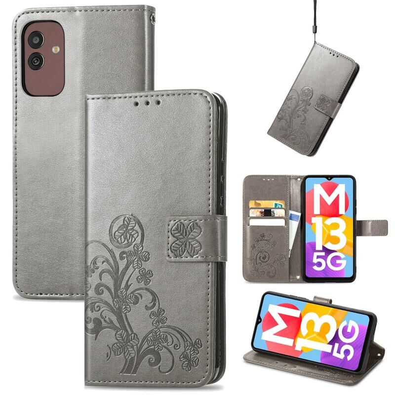 Για Samsung Galaxy M13 5G Four-leaf κούμπωμα ανάγλυφο αγκράφα δερμάτινη θήκη τηλεφώνου (γκρι)