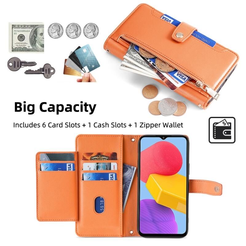 Θήκη κινητού Samsung Galaxy M13, δερμάτινη με φερμουάρ και σχέδιο προβάτου, για crossbody (Πορτοκαλί)