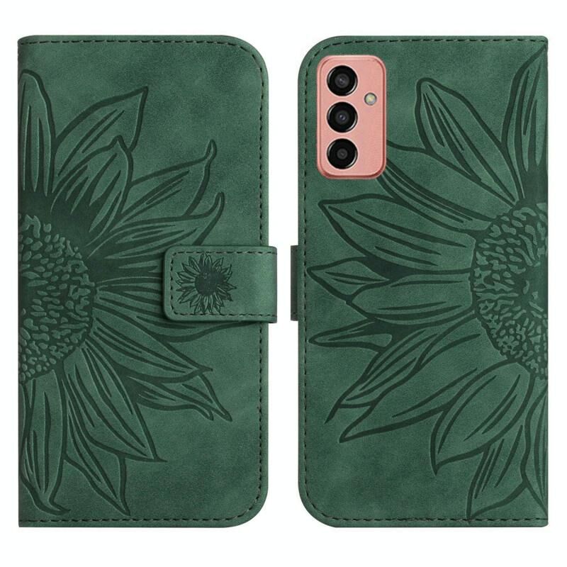 Για το Samsung Galaxy M13 δέρμα αίσθηση Sun Flower μοτίβο Flip δέρμα τηλέφωνο υπόθεση με κορδόνι (πράσινο)