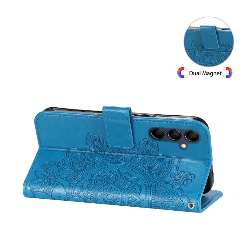 Για Samsung Galaxy M14 5G 7-πέταλο λουλούδια ανάγλυφο δέρμα υπόθεση τηλεφώνου (μπλε)