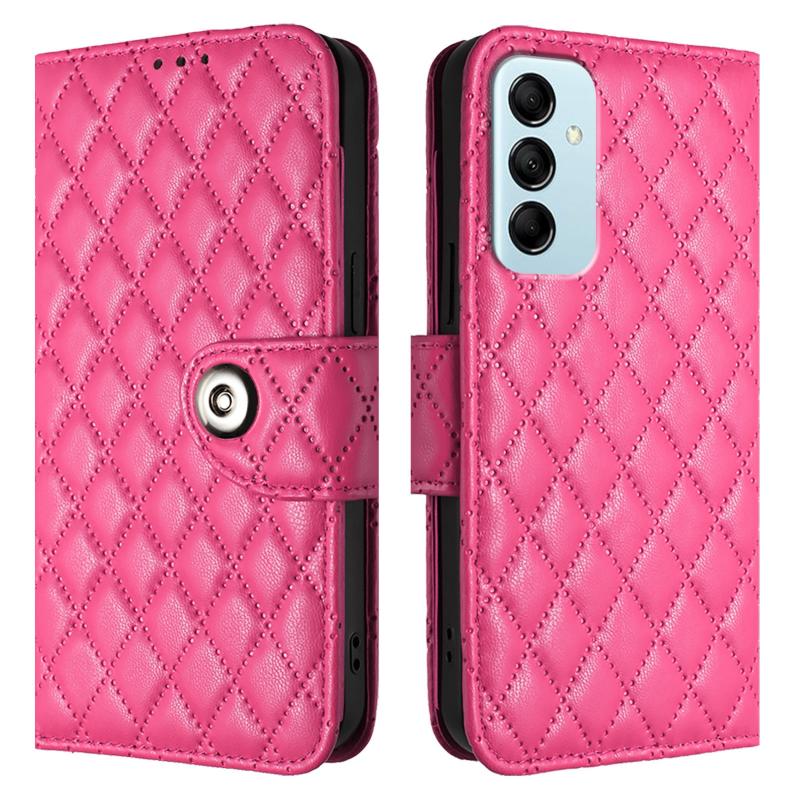For Samsung Galaxy M14 5G Global Rhombic Texture Flip Leather Phone Case with Lanyard(Rose Red)