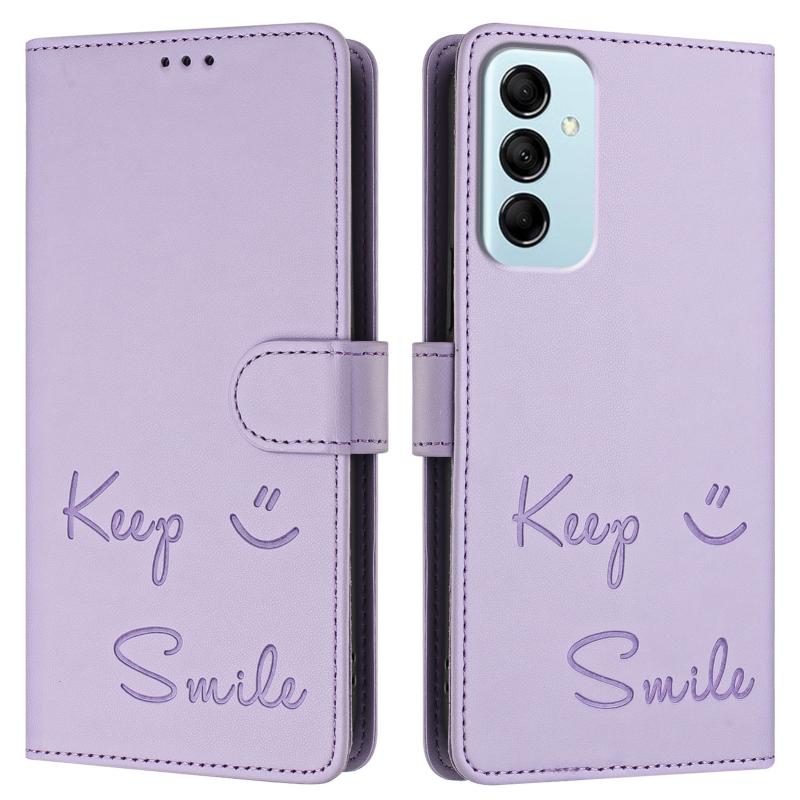 For Samsung Galaxy M14 5G Global Smile Embossing RFID Leather Phone Case(Light Purple)