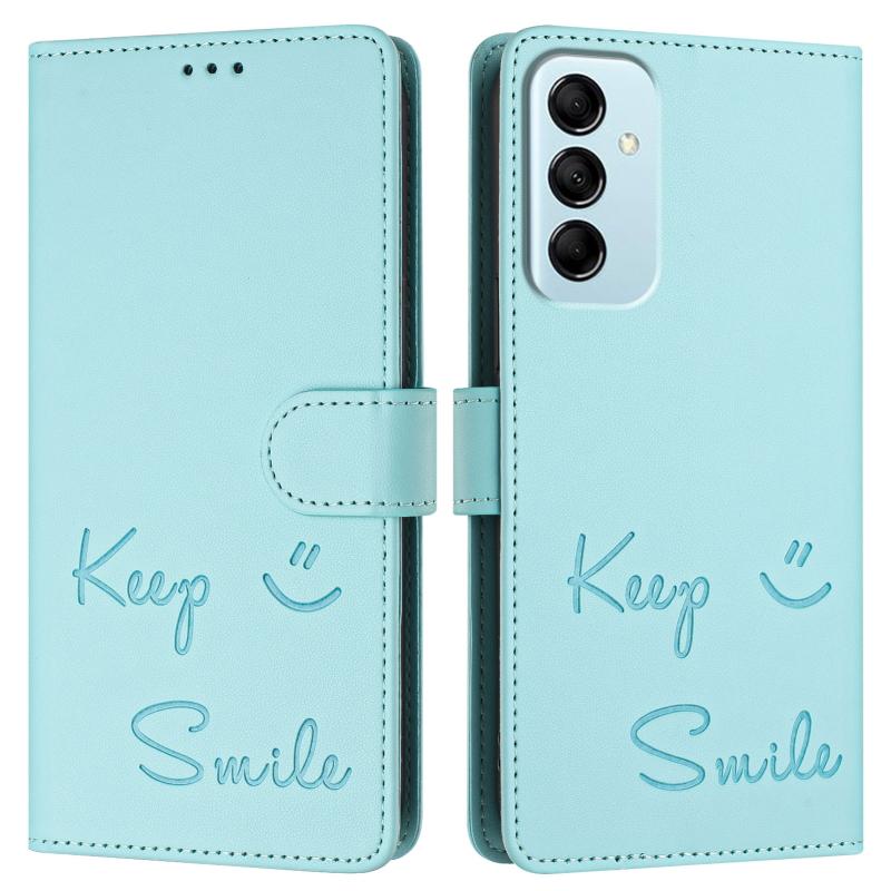 For Samsung Galaxy M14 5G Global Smile Embossing RFID Leather Phone Case(Mint Green)