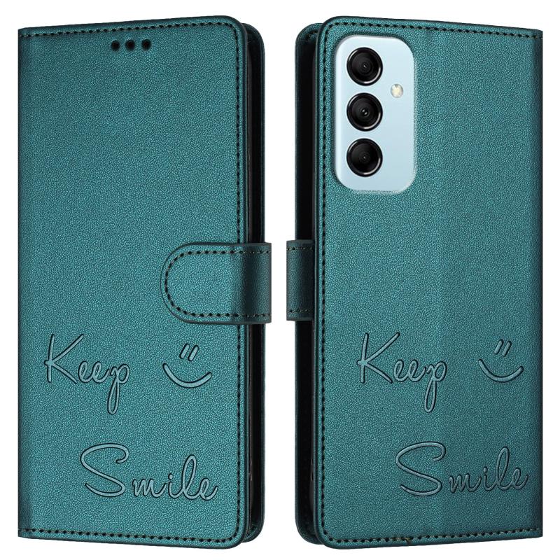For Samsung Galaxy M14 5G Global Smile Embossing RFID Leather Phone Case(Peacock Green)