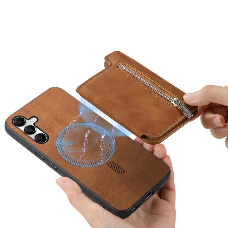 Θήκη κινητού Samsung Galaxy M14 5G με φερμουάρ, τσέπη για κάρτες και μαγνητική σύνδεση τύπου MagSafe, σε κίτρινο χρώμα.