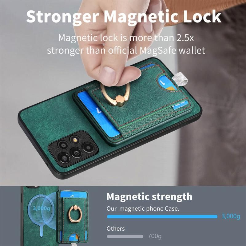 5. Το δερμάτινο πορτοφόλι διαθέτει ισχυρούς ενσωματωμένους μαγνήτες που του επιτρέπουν να κουμπώνει αβίαστα στη θέση του στο πίσω μέρος του τηλεφώνου σας, εύκολο στη χρήση και την αφαίρεση.