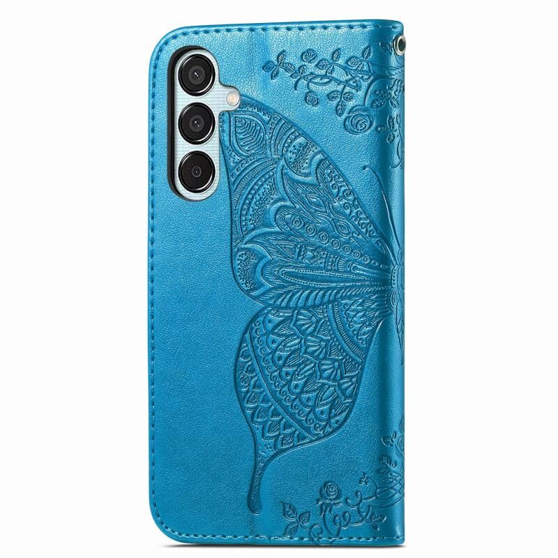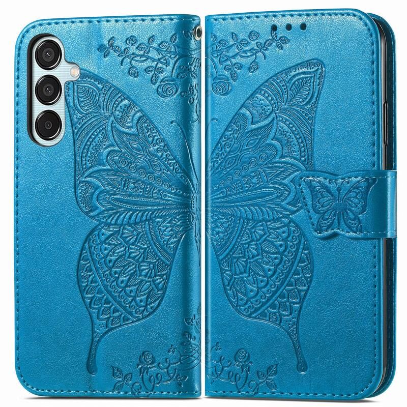 Για Samsung Galaxy M15 πεταλούδα αγάπη λουλούδι ανάγλυφο δερμάτινη θήκη τηλεφώνου (μπλε)